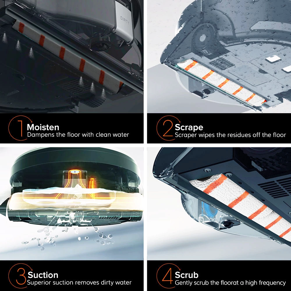 Scrub: Ultrafine fiber roller deeply washes the floor with gentle scrubs at a high frequency.