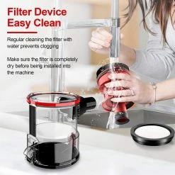 The filtering system of this corded vacuum cleaner is composed of a mesh filter on the top and a cyclone filter on the top and bottom. Efficient, can effectively intercept and separate dust and debris of different sizes, can also speed up the airflow, prevent the motor from being blocked by dust, and extend the service life of the vacuum cleaner.