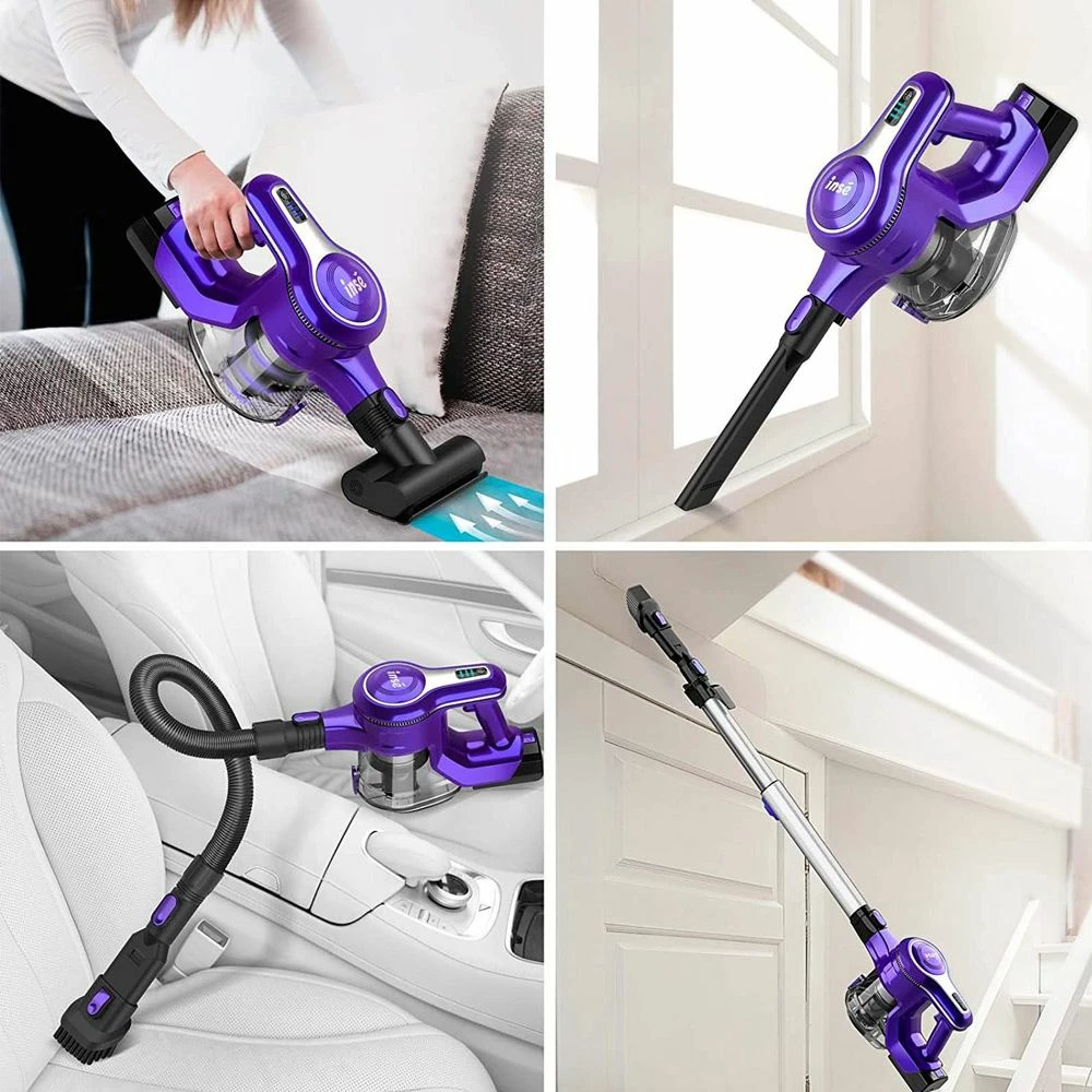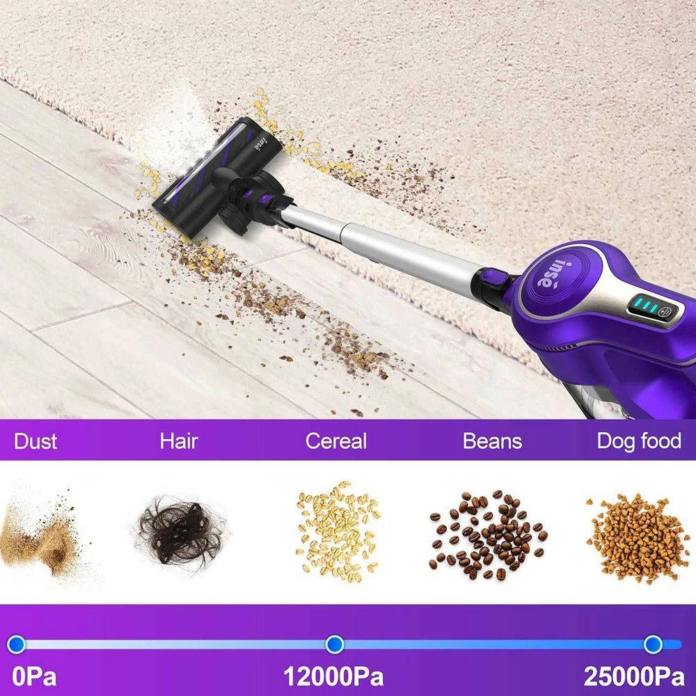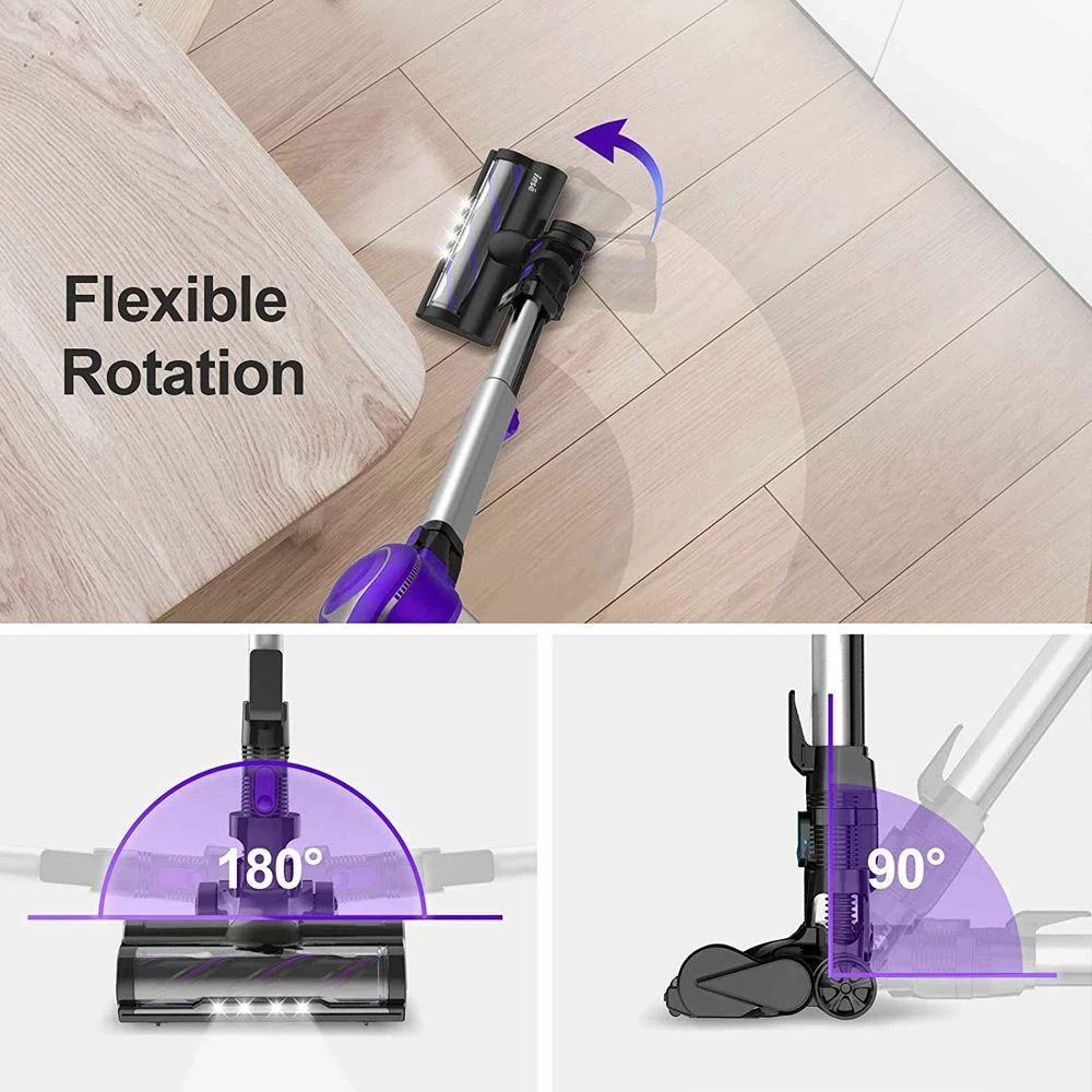 You do not always have to hold down the button when using it. With a stiff and soft roller, the vacuum cleaner is suitable for carpets (2-3 cm) and hardwood floors. A flexible LED electric brush can be rotated 180° (side) and 90° (up and down), you can see and clean the dust under furniture and bed (over 5.08 cm).