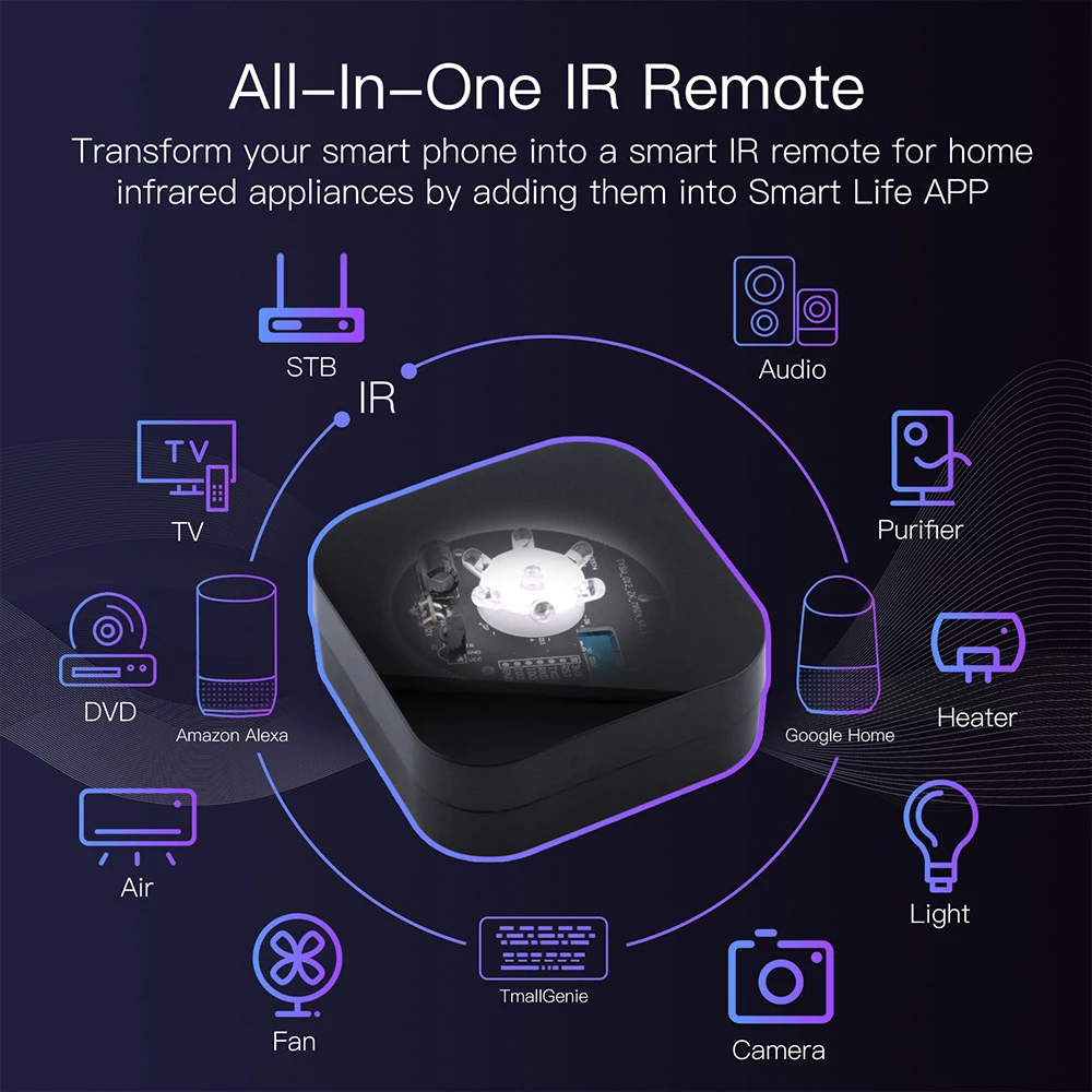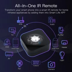 This IR remote control devotes to activating house infrared appliances such as air conditioners, TVs, fans, DVDs, STBs, TV BOXes, etc. with one single MOES SMART IR (Only support Ir (38KHZ ), RF not included), adding all compatible devices into the remote for wireless remote control by smartphones anywhere you like; Control your appliances in advance when you are away from home.