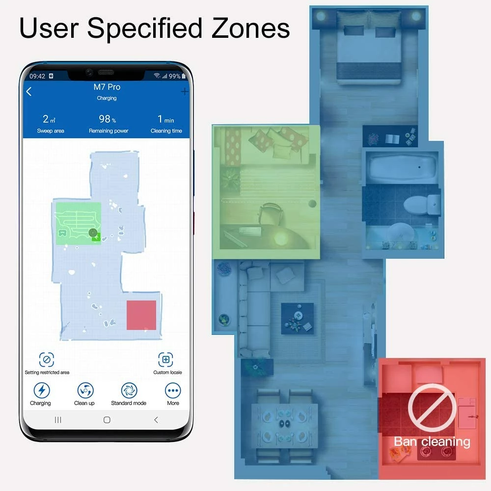 It allows you to control where you want the machine to go, or not to go. With the Proscenic Home app, you can switch between cleaning modes, schedule cleaning, select room cleaning, create virtual no-go zones, set zones to clean. Besides, this robot vacuum can save multi floors map for you.