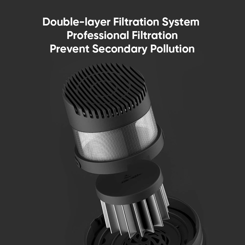 The double-layer filtration system is adopted, and the 200-mesh primary filter screen is matched with the HEPA F7 grade spun lace membrane filter element, which can effectively filter fine dust and prevent secondary pollution, and the filter can be rinsed with clean water and used again.