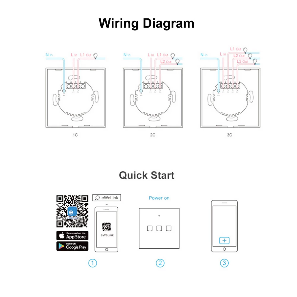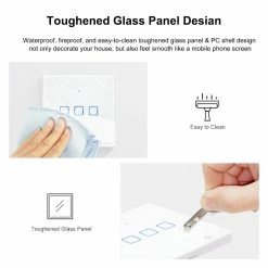 | Specification | Input: AC 100-240V 50/60Hz 2A Max Output: AC 100-240V 50/60Hz, 2A/Gang, 6A/Total Max Enclosure Material: Toughened Glass Panel + PC Wireless Standard: IEEE 802.11 b/g/n 2.4G |