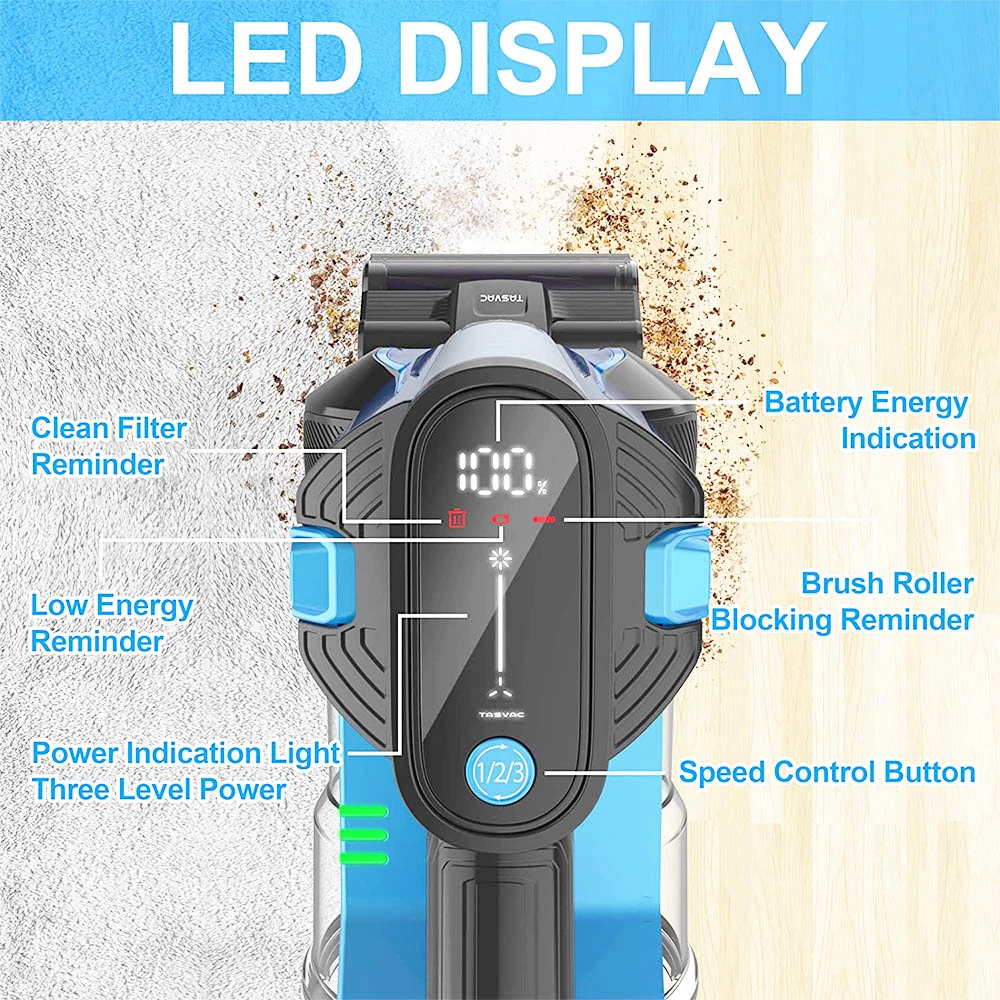 Vacuum cleaner cordless with motorized, 150°rotating cleaner head with 4 bright LED lights, you can swivel the wand sideways and up and down to easily clean dust under the sofa.