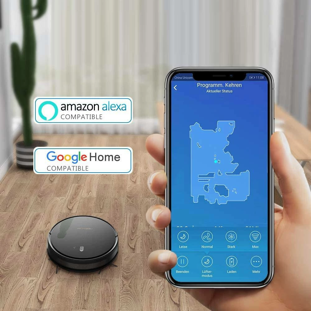 The robot can be controlled either by the free smartphone app (English language not guaranteed) or by the voice commands on Alexa or Google Home and the cleaning can be watched in real-time. Please note, however, extensive operating instructions are included with the package (English language not guaranteed).