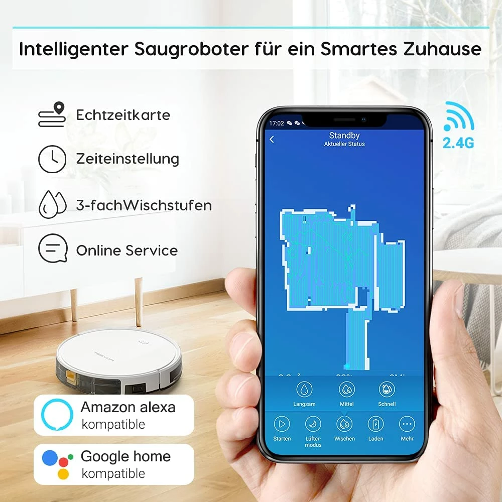 Use the free newly developed app for displaying cleaning routes and map storage, scheduling, cleaning zones, stain removal, directional control, point cleaning. Compatible with Google Home and Alexa.