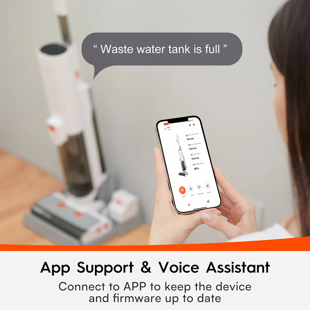To ensure the best cleaning performance, please connect to Ultenic APP to keep the wet-dry vacuum cleaner and firmware up to date before use. It can help you optimize the amount of water dispensed, monitor the cleaning status, get the instructions for use, troubleshoot, and faster online customer support.