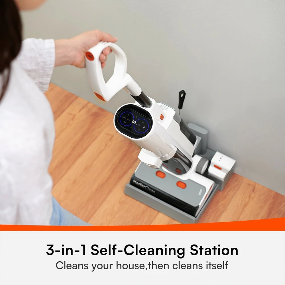 | Specification | Rated Power: 200W Rated Voltage: 21.6V Input Power: 100-240V, 1A, 50-60Hz Clean Water Tank Capacity: 1000ml Dirty Water Tank Capacity: 1000ml Charging Time: 4h Suction Power: MAX Mode: 15±1Kpa Smart Mode: 7.5±1kpa-15KPa Working Time: MAX Mode: 25±5min Smart Mode: 45±5min Hepa Level: H10 Battery Capacity: 4000mAh Operating Noise: 70 – 76db Smart LED: support Surface Recommendation: Hard Floor, Wooden Floor, Carpet |