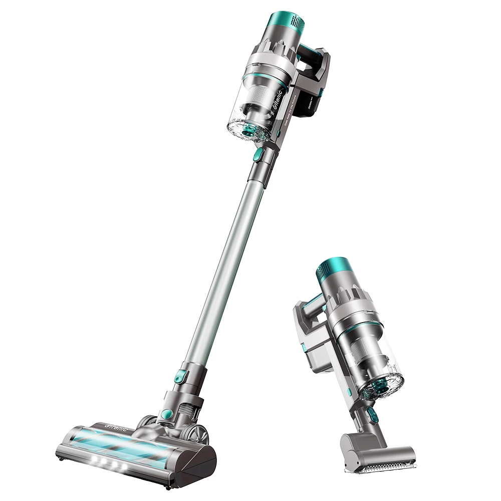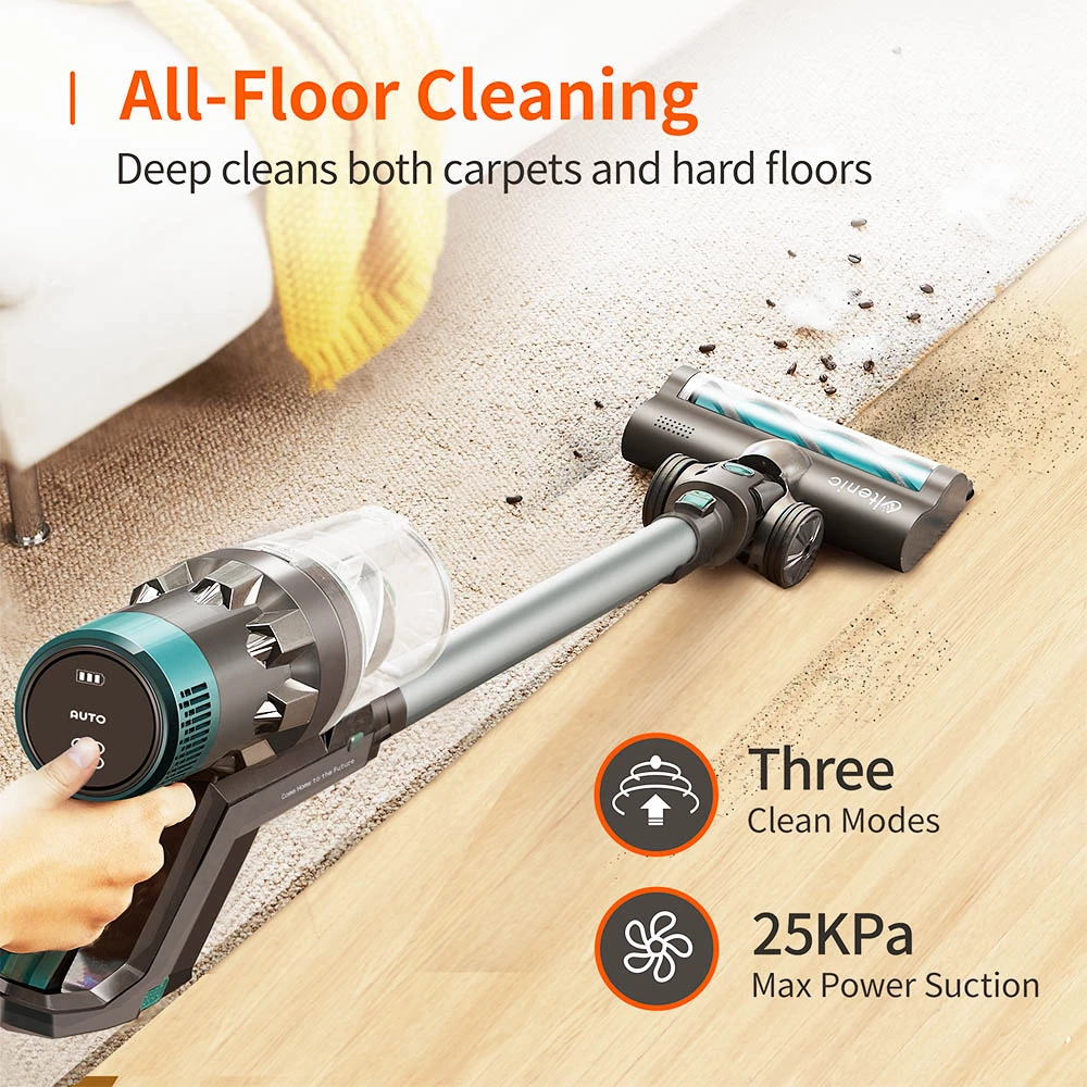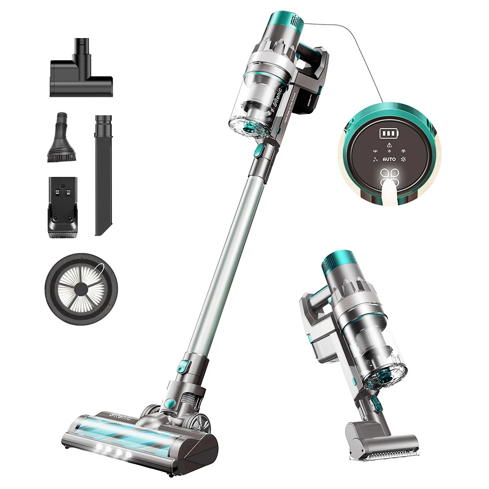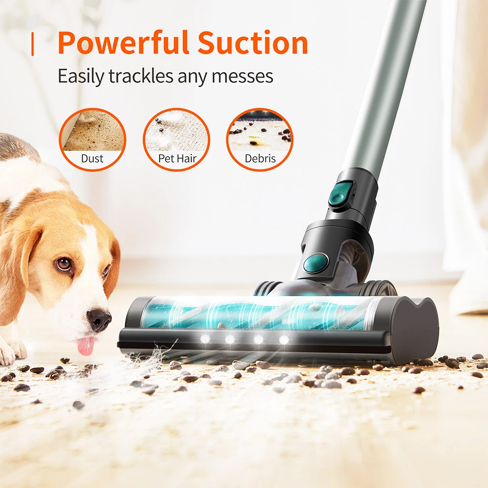 The LED touch screen can clearly show the battery status and settings, The LED headlights can make cleaning in the dark corners easily. This simple floor-mounted stand can store and charge both the vacuum cleaner and 4 different auxiliary brushes easily and neatly, which can also make your home looks well-orgnazied and tidy.